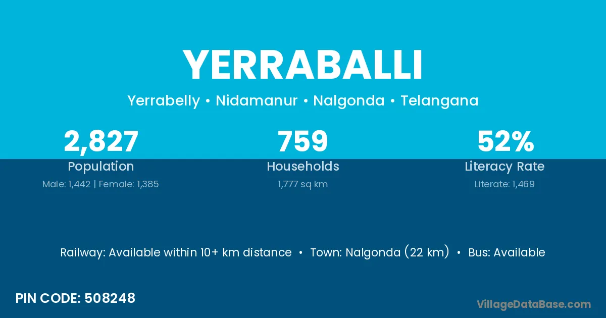 Nalgonda (22 km) is the nearest town to Yerraballi village for major economic activities and is located approximately 22 km away.