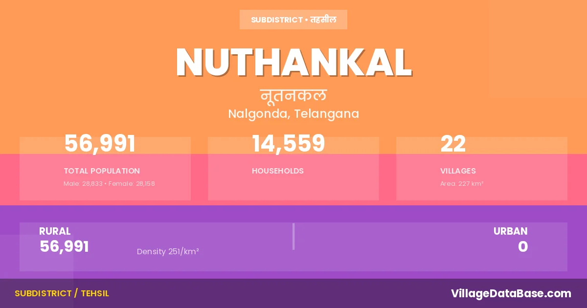 According to the 2011 census The total area of Nuthankal Mandal is 227 km², with a population of 56991 people. The population density is 251 inhabitants per square kilometre, and there are approximately 14559 houses in the sub district.