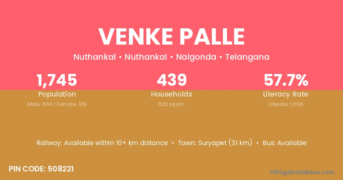 Suryapet (31 km) is the nearest town to Venke Palle village for major economic activities and is located approximately 31 km away.