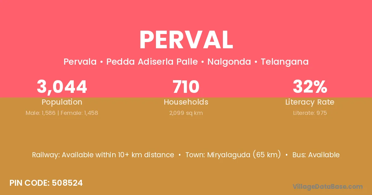 Miryalaguda (65 km) is the nearest town to Perval village for major economic activities and is located approximately 65 km away.