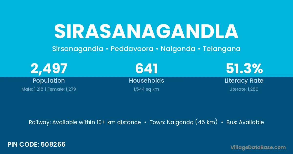 Nalgonda (45 km) is the nearest town to Sirasanagandla village for major economic activities and is located approximately 45 km away.