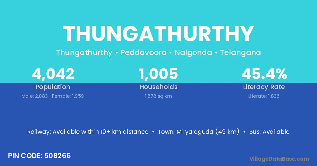 Miryalaguda (49 km) is the nearest town to Thungathurthy village for major economic activities and is located approximately 49 km away.