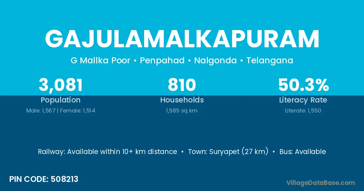 Suryapet (27 km) is the nearest town to Gajulamalkapuram village for major economic activities and is located approximately 27 km away.