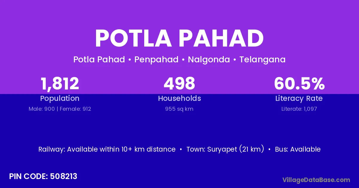 Suryapet (21 km) is the nearest town to Potla Pahad village for major economic activities and is located approximately 21 km away.