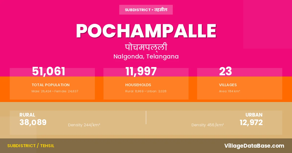 According to the 2011 census The total area of Pochampalle Mandal is 184 km², with a population of 51061 people. The population density is 277 inhabitants per square kilometre, and there are approximately 11997 houses in the sub district.