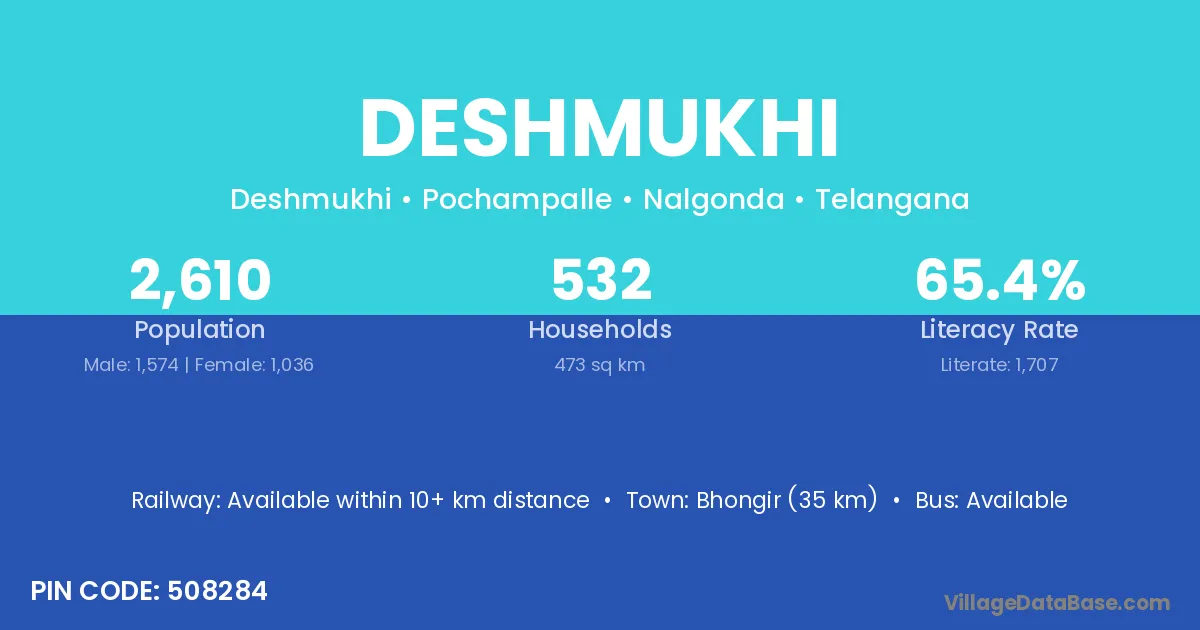Bhongir (35 km) is the nearest town to Deshmukhi village for major economic activities and is located approximately 35 km away.