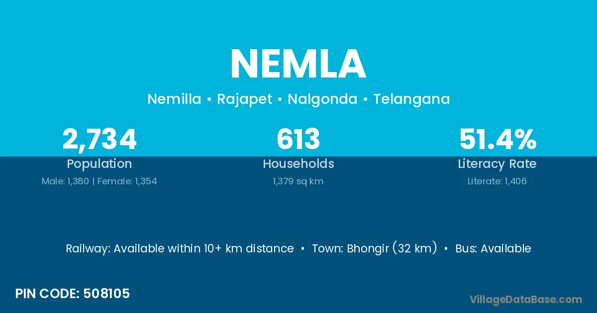 Bhongir (32 km) is the nearest town to Nemla village for major economic activities and is located approximately 32 km away.