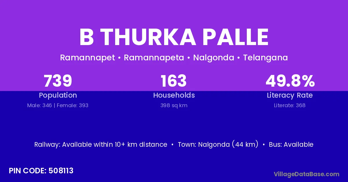Nalgonda (44 km) is the nearest town to B Thurka Palle village for major economic activities and is located approximately 44 km away.