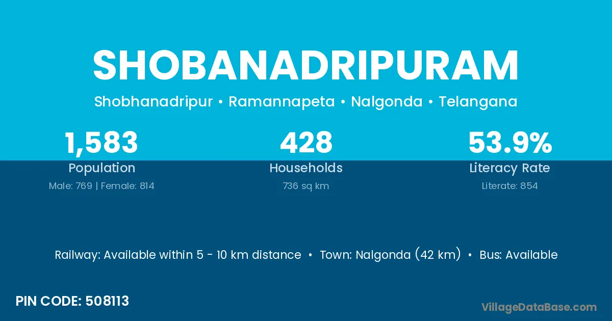 Nalgonda (42 km) is the nearest town to Shobanadripuram village for major economic activities and is located approximately 42 km away.