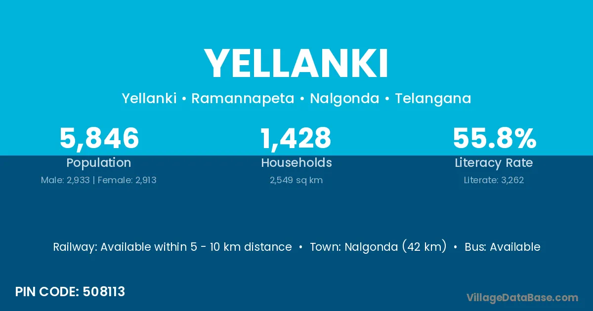 Nalgonda (42 km) is the nearest town to Yellanki village for major economic activities and is located approximately 42 km away.