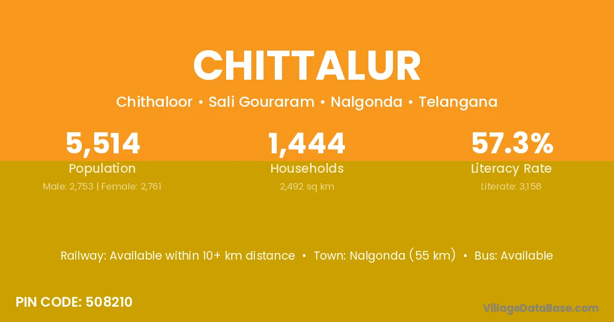 Nalgonda (55 km) is the nearest town to Chittalur village for major economic activities and is located approximately 55 km away.