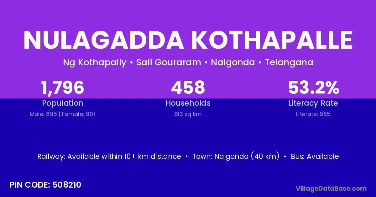 Nalgonda (40 km) is the nearest town to Nulagadda Kothapalle village for major economic activities and is located approximately 40 km away.