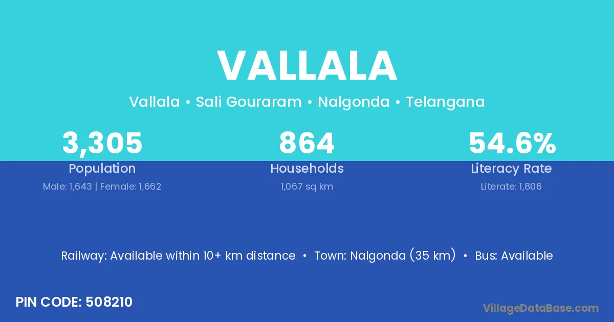 Nalgonda (35 km) is the nearest town to Vallala village for major economic activities and is located approximately 35 km away.