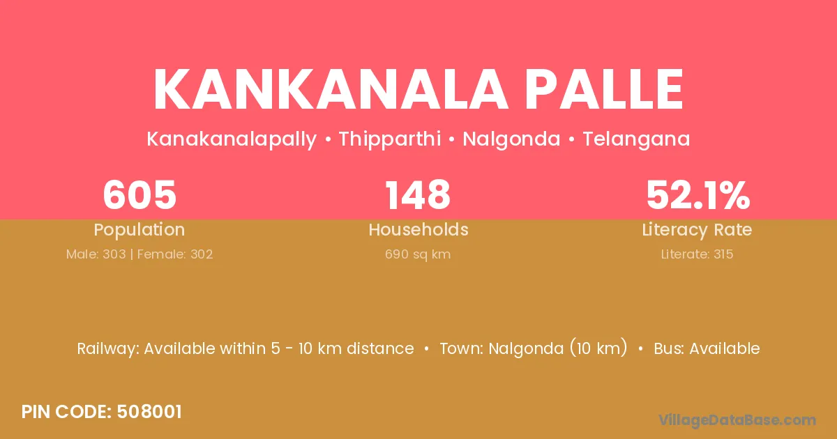 Kankanala Palle village has a total population of 605 people, of which 303 are males and 302 are females.