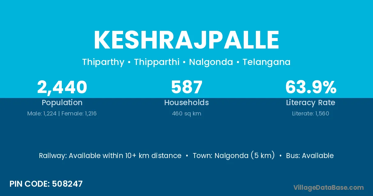 Nalgonda (5 km) is the nearest town to Keshrajpalle village for major economic activities and is located approximately 5 km away.