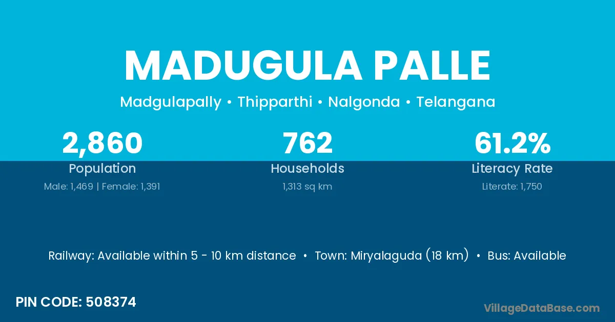 Miryalaguda (18 km) is the nearest town to Madugula Palle village for major economic activities and is located approximately 18 km away.
