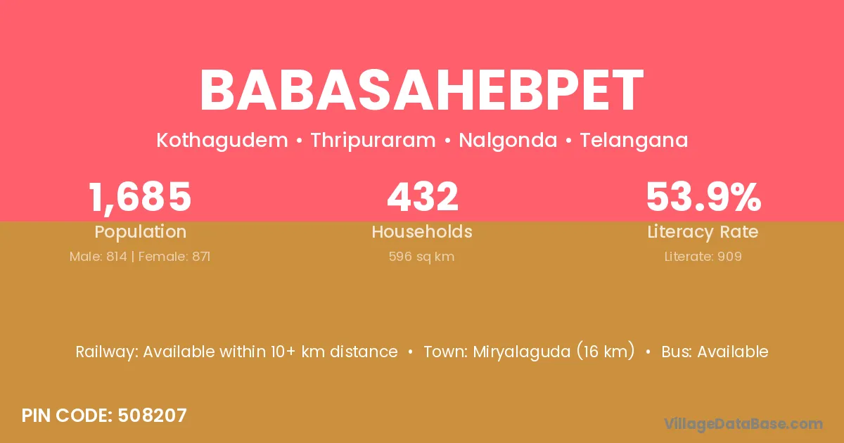 Miryalaguda (16 km) is the nearest town to Babasahebpet village for major economic activities and is located approximately 16 km away.