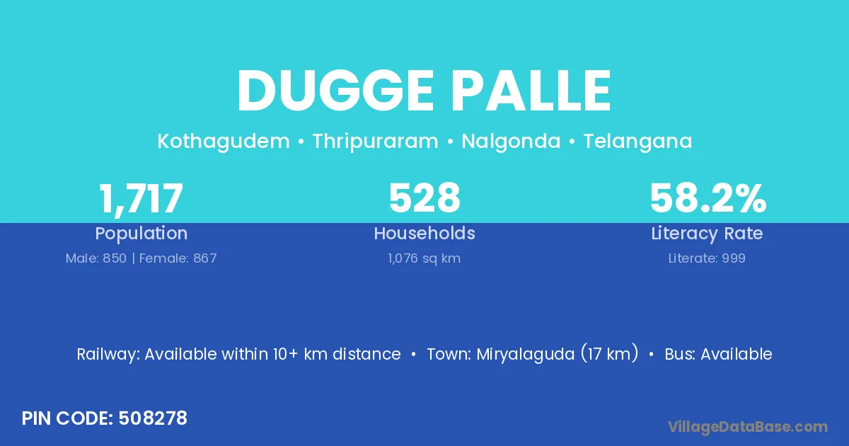 Miryalaguda (17 km) is the nearest town to Dugge Palle village for major economic activities and is located approximately 17 km away.