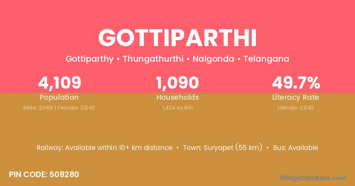 Suryapet (55 km) is the nearest town to Gottiparthi village for major economic activities and is located approximately 55 km away.