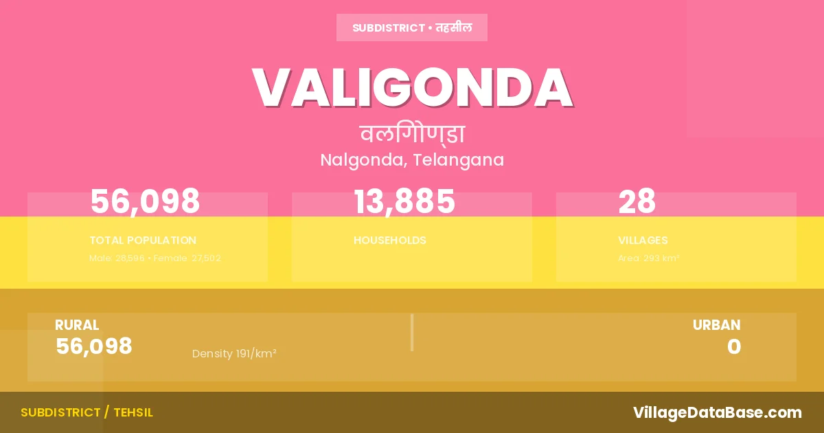 According to the 2011 census The total area of Valigonda Mandal is 293 km², with a population of 56098 people. The population density is 191 inhabitants per square kilometre, and there are approximately 13885 houses in the sub district.