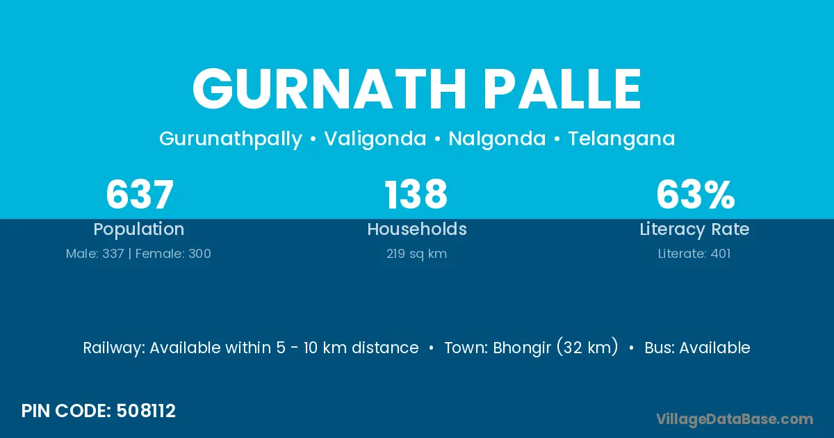 Bhongir (32 km) is the nearest town to Gurnath Palle village for major economic activities and is located approximately 32 km away.