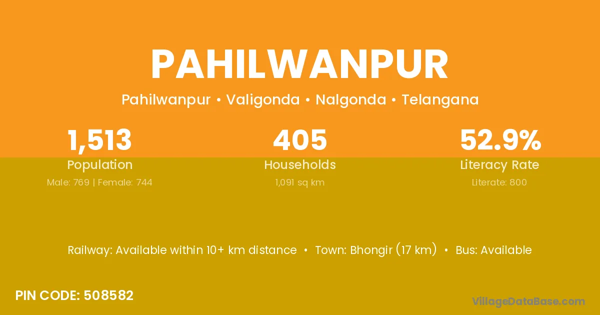 Bhongir (17 km) is the nearest town to Pahilwanpur village for major economic activities and is located approximately 17 km away.