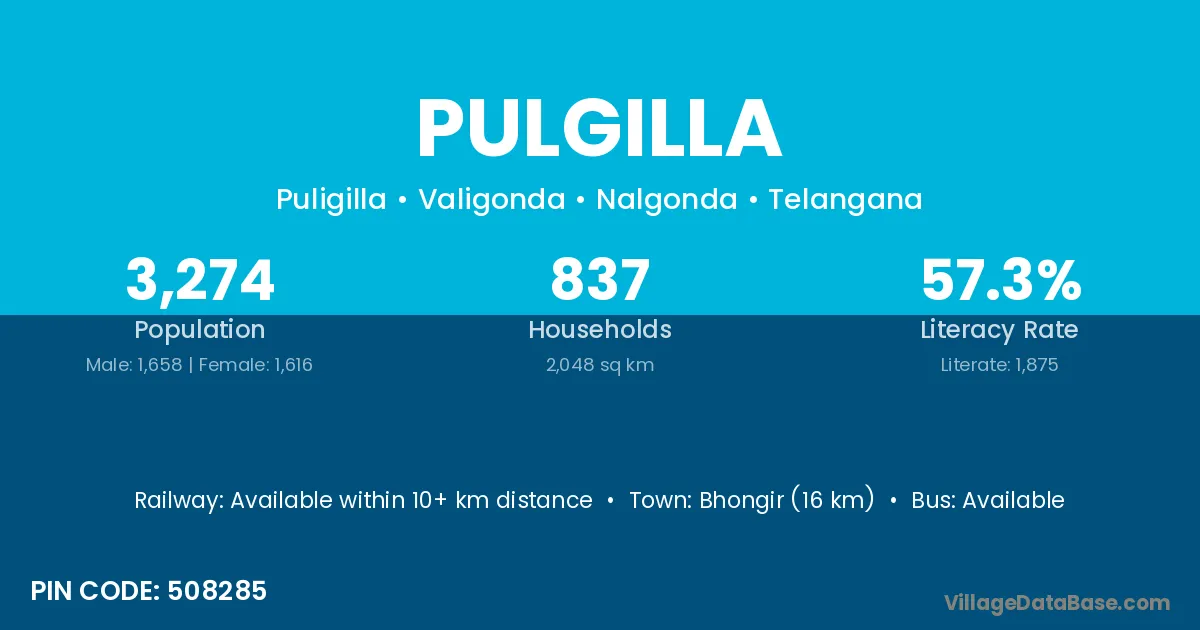 Bhongir (16 km) is the nearest town to Pulgilla village for major economic activities and is located approximately 16 km away.
