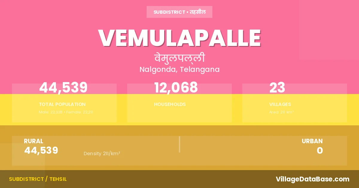 According to the 2011 census The total area of Vemulapalle Mandal is 211 km², with a population of 44539 people. The population density is 211 inhabitants per square kilometre, and there are approximately 12068 houses in the sub district.