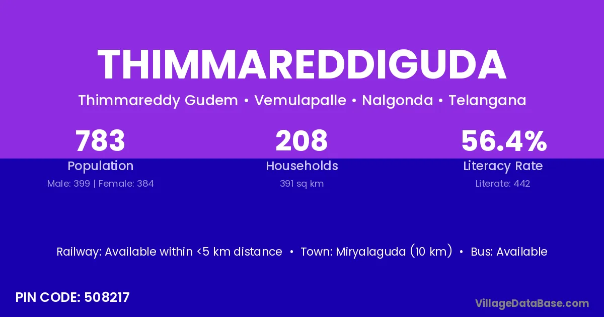 Miryalaguda (10 km) is the nearest town to Thimmareddiguda village for major economic activities and is located approximately 10 km away.
