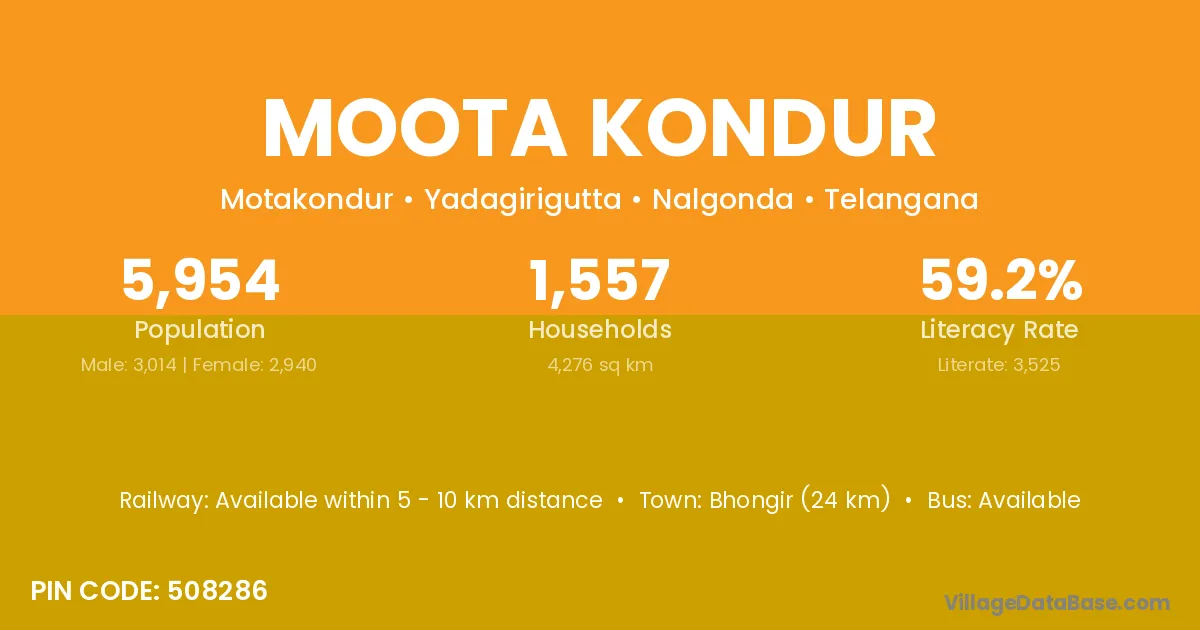 Bhongir (24 km) is the nearest town to Moota Kondur village for major economic activities and is located approximately 24 km away.