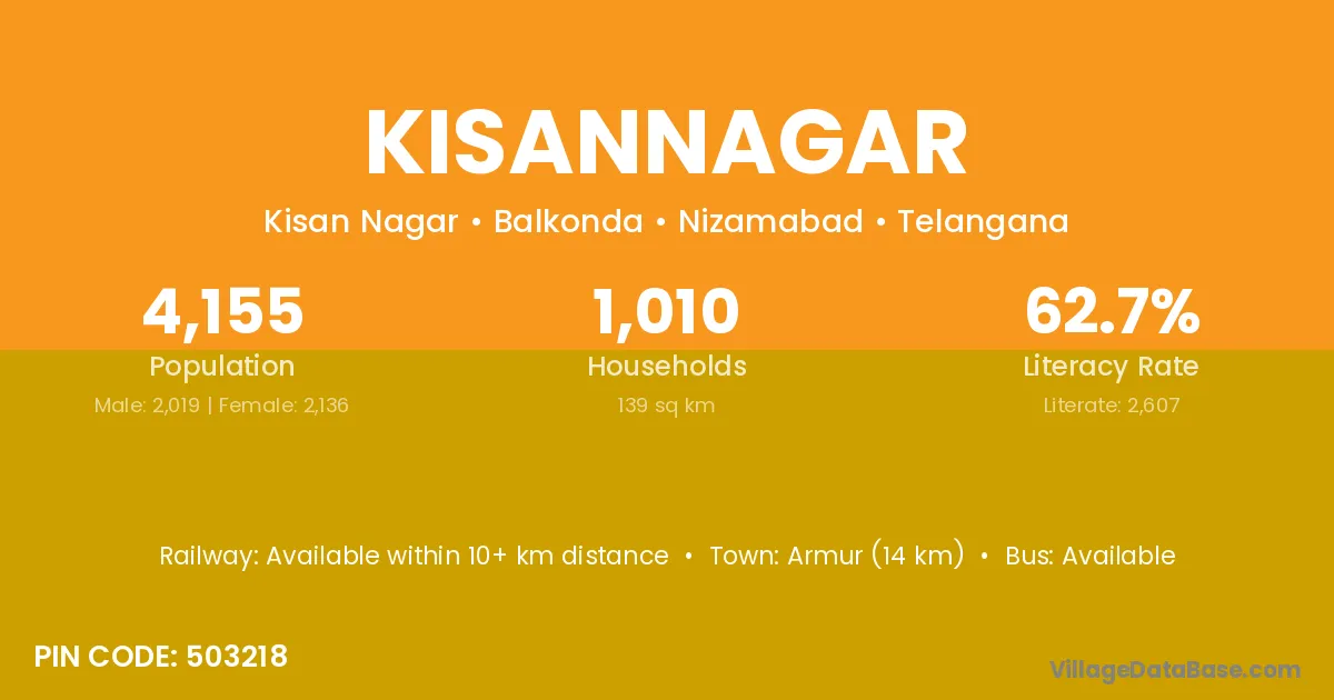 Armur (14 km) is the nearest town to Kisannagar village for major economic activities and is located approximately 14 km away.