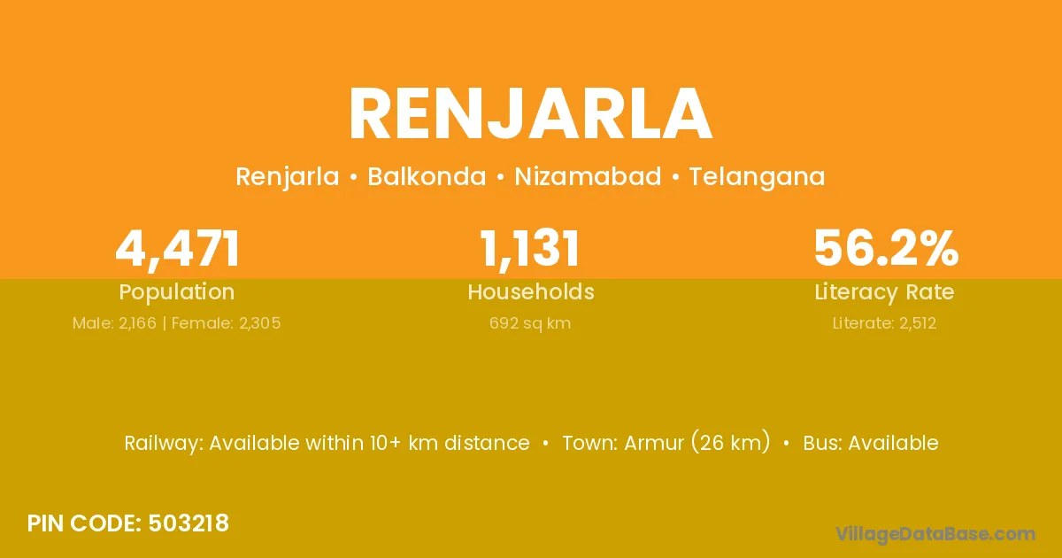 Armur (26 km) is the nearest town to Renjarla village for major economic activities and is located approximately 26 km away.