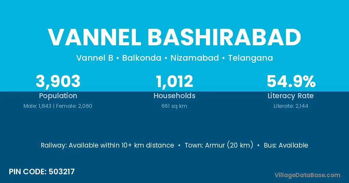 Vannel Bashirabad village has a total population of 3,903 people, of which 1,843 are males and 2,060 are females.