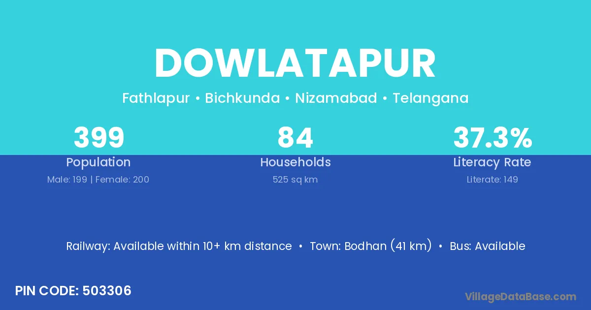 Bodhan (41 km) is the nearest town to Dowlatapur village for major economic activities and is located approximately 41 km away.
