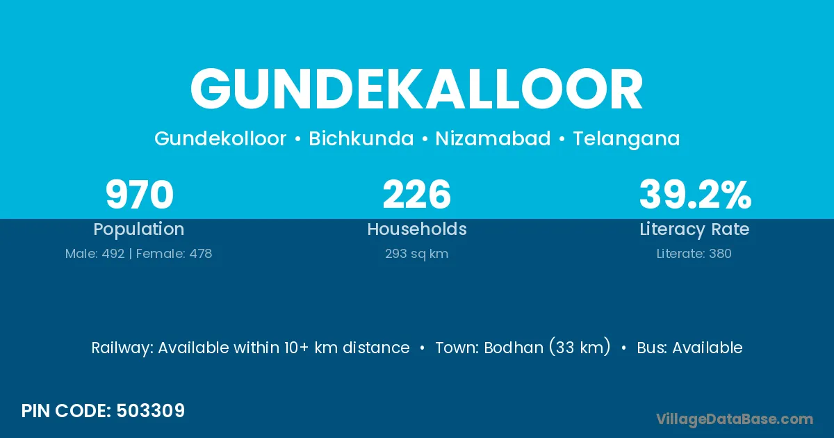 Bodhan (33 km) is the nearest town to Gundekalloor village for major economic activities and is located approximately 33 km away.