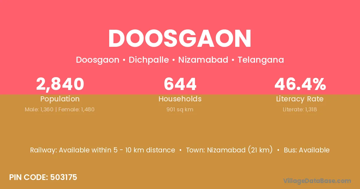 Nizamabad (21 km) is the nearest town to Doosgaon village for major economic activities and is located approximately 21 km away.