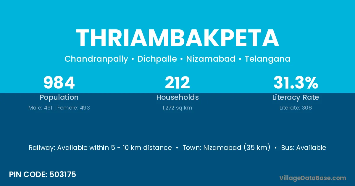 Nizamabad (35 km) is the nearest town to Thriambakpeta village for major economic activities and is located approximately 35 km away.