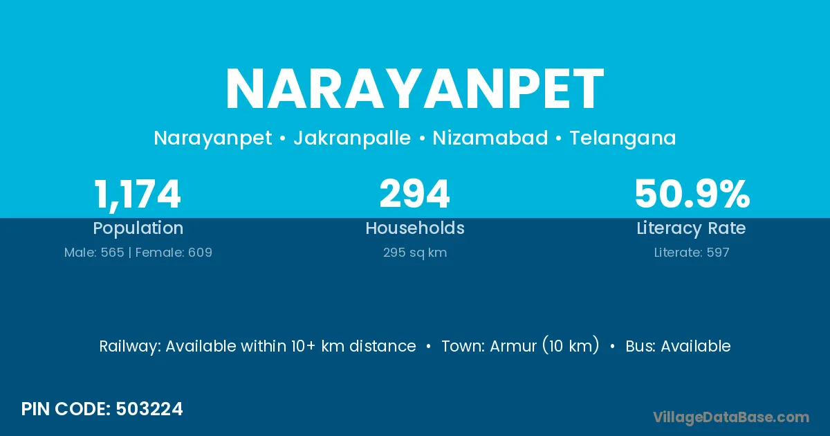 Armur (10 km) is the nearest town to Narayanpet village for major economic activities and is located approximately 10 km away.