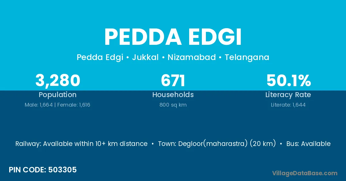Degloor(maharastra) (20 km) is the nearest town to Pedda Edgi village for major economic activities and is located approximately 20 km away.