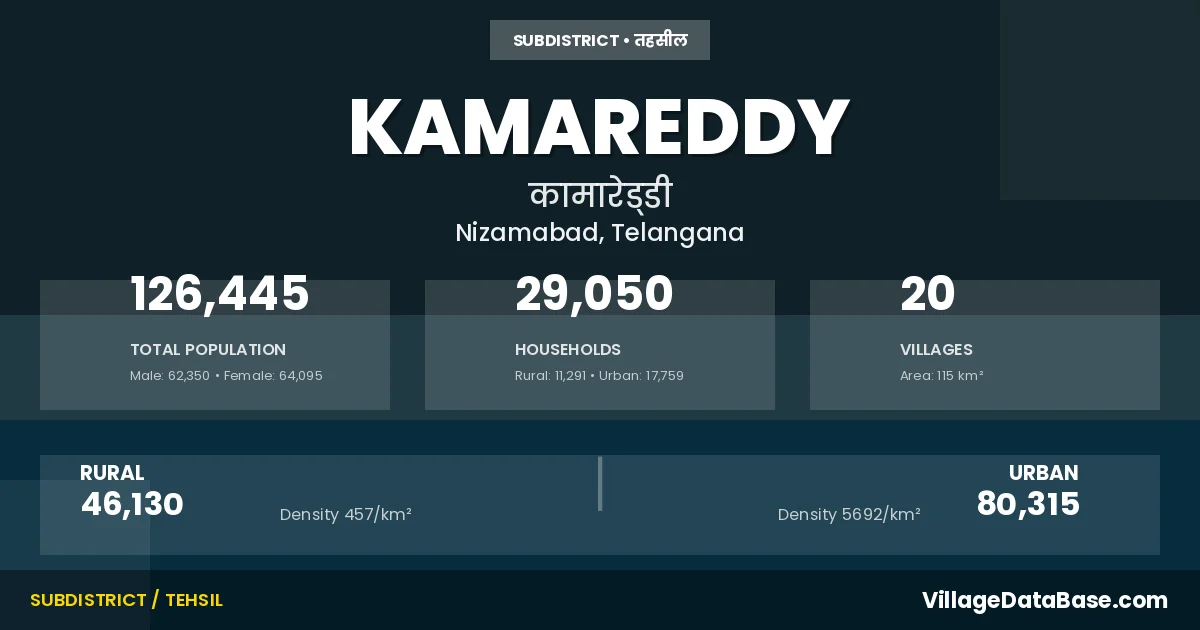 According to the 2011 census The total area of Kamareddy Mandal is 115 km², with a population of 126445 people. The population density is 1,099 inhabitants per square kilometre, and there are approximately 29050 houses in the sub district.