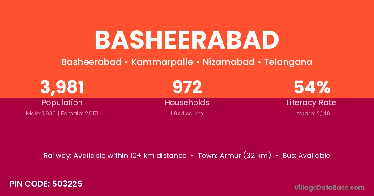 Armur (32 km) is the nearest town to Basheerabad village for major economic activities and is located approximately 32 km away.