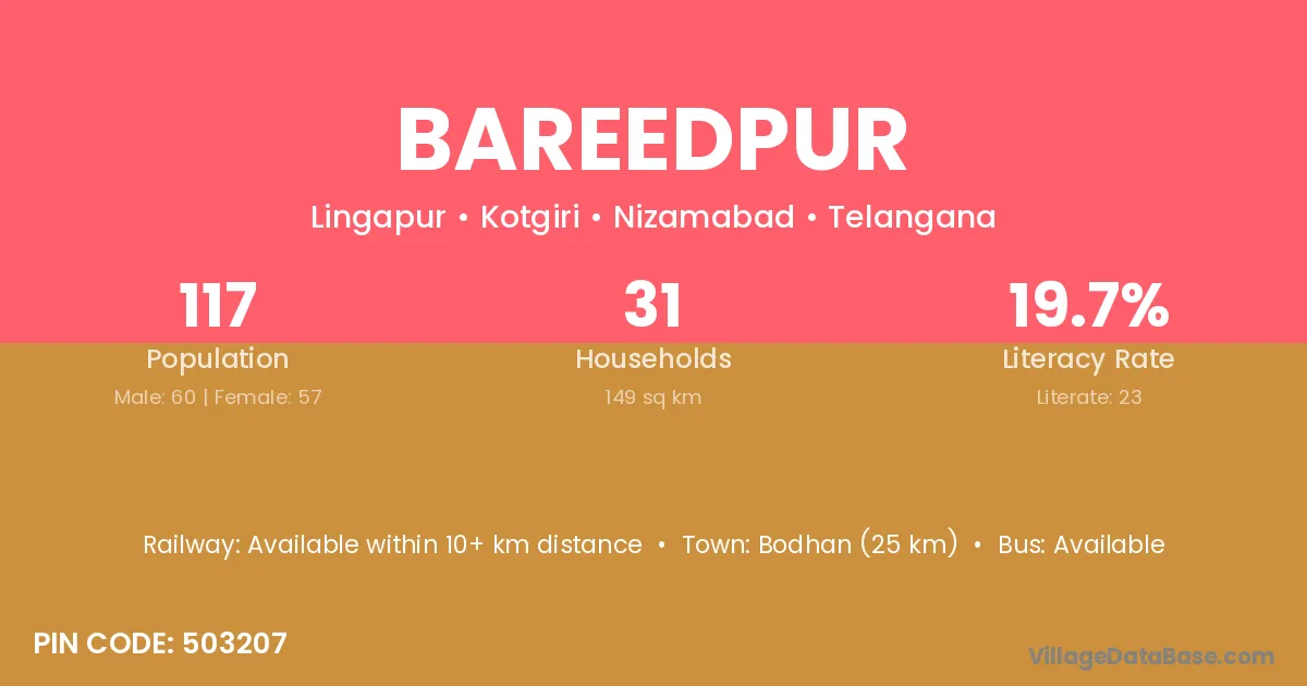 Bodhan (25 km) is the nearest town to Bareedpur village for major economic activities and is located approximately 25 km away.