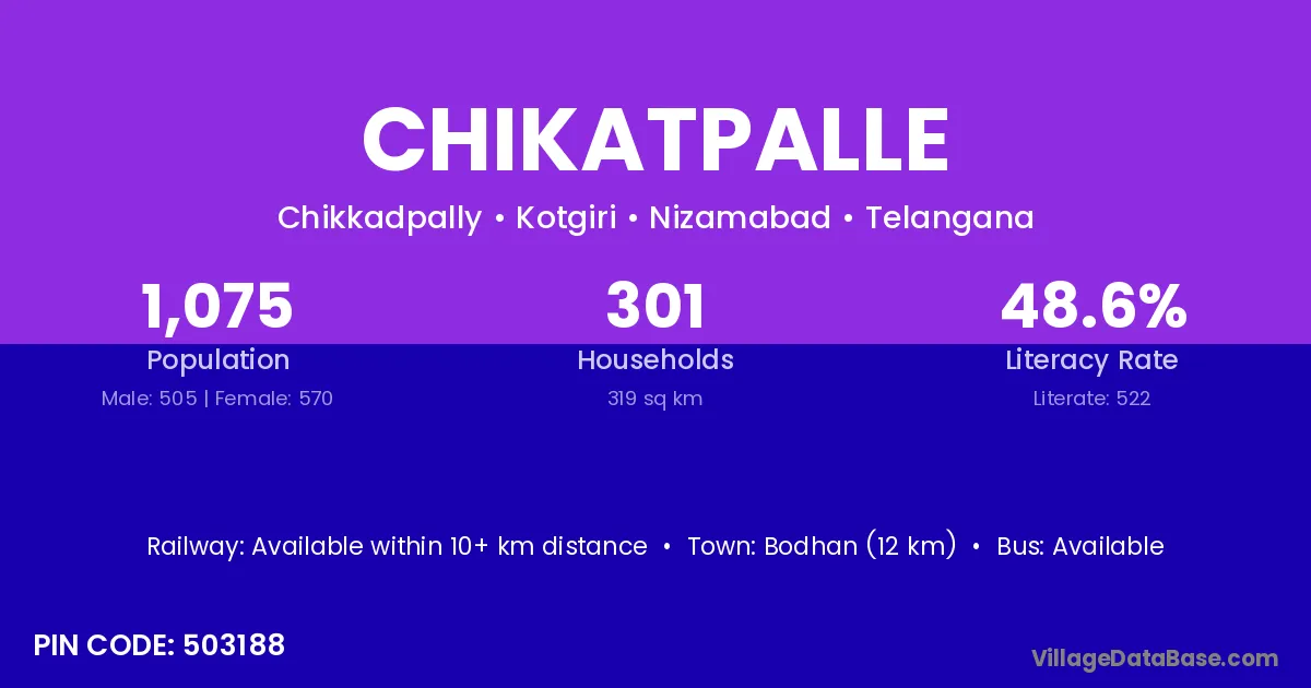 Bodhan (12 km) is the nearest town to Chikatpalle village for major economic activities and is located approximately 12 km away.