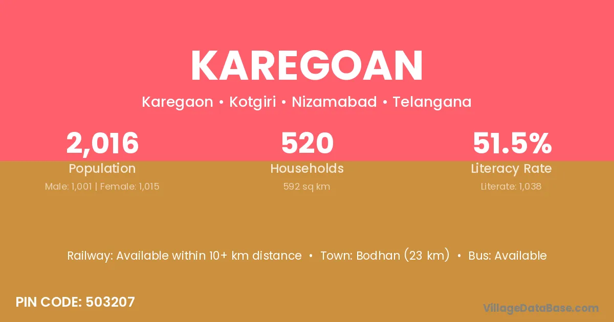 Bodhan (23 km) is the nearest town to Karegoan village for major economic activities and is located approximately 23 km away.