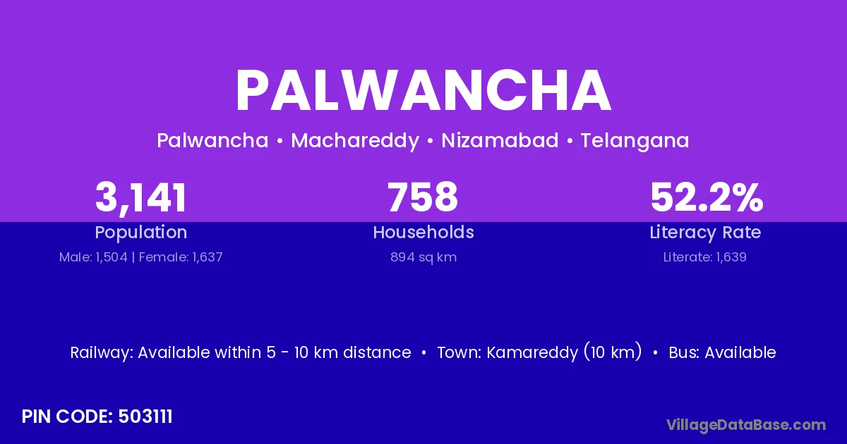 Kamareddy (10 km) is the nearest town to Palwancha village for major economic activities and is located approximately 10 km away.