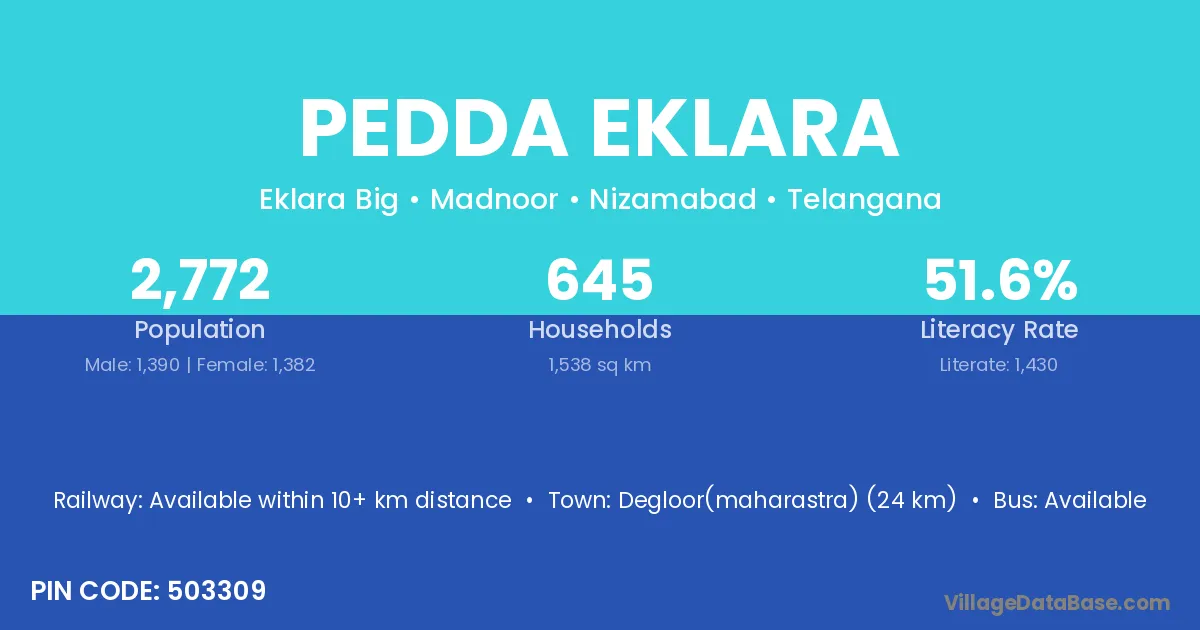 Degloor(maharastra) (24 km) is the nearest town to Pedda Eklara village for major economic activities and is located approximately 24 km away.