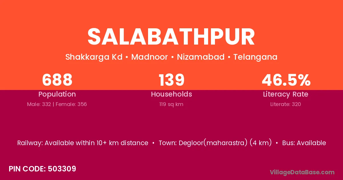 Degloor(maharastra) (4 km) is the nearest town to Salabathpur village for major economic activities and is located approximately 4 km away.