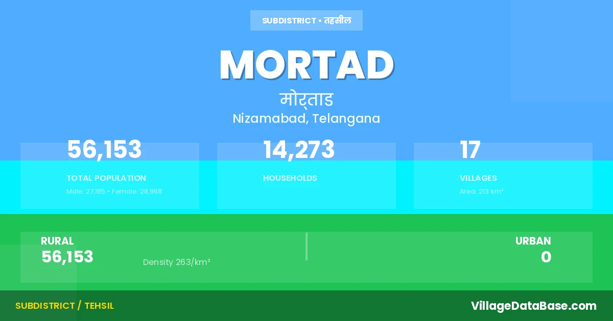 Mortad is a town and Mandal in the Nizamabad district of the Telangana. In India, a Mandal is a subdivision of a district responsible for the administration and revenue collection of a specific area within the district. Mandals play a crucial role in the local governance structure, contributing significantly to the development and administration of their communities.