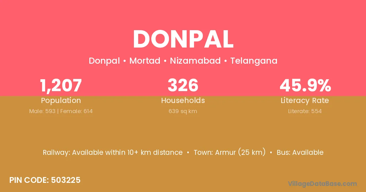 Armur (25 km) is the nearest town to Donpal village for major economic activities and is located approximately 25 km away.