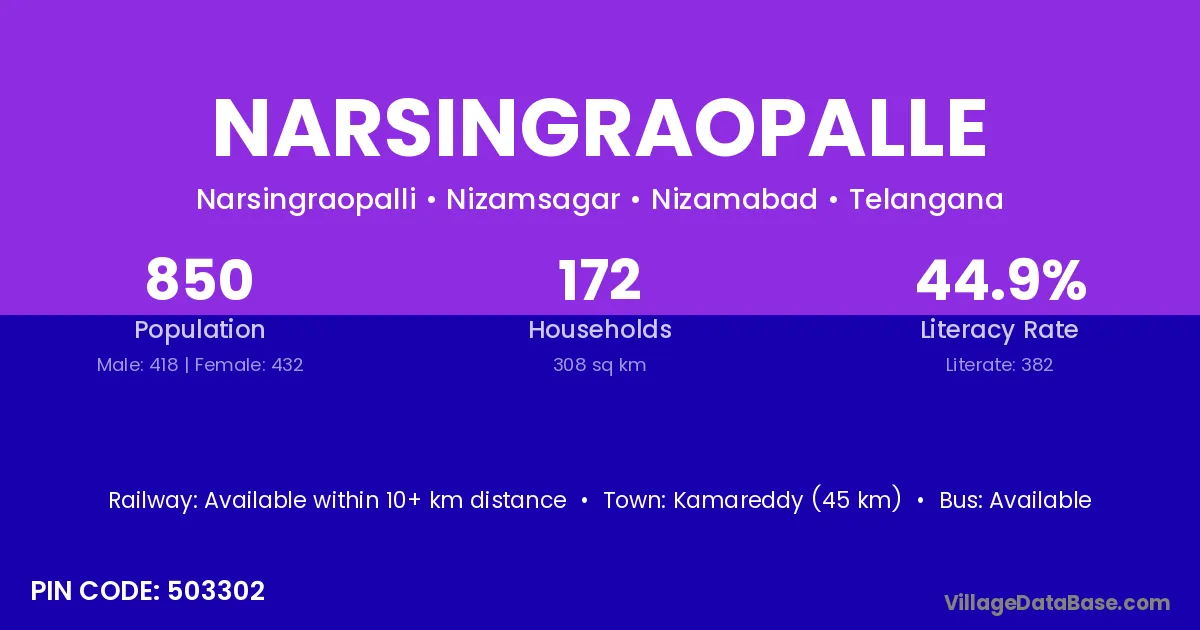 Kamareddy (45 km) is the nearest town to Narsingraopalle village for major economic activities and is located approximately 45 km away.